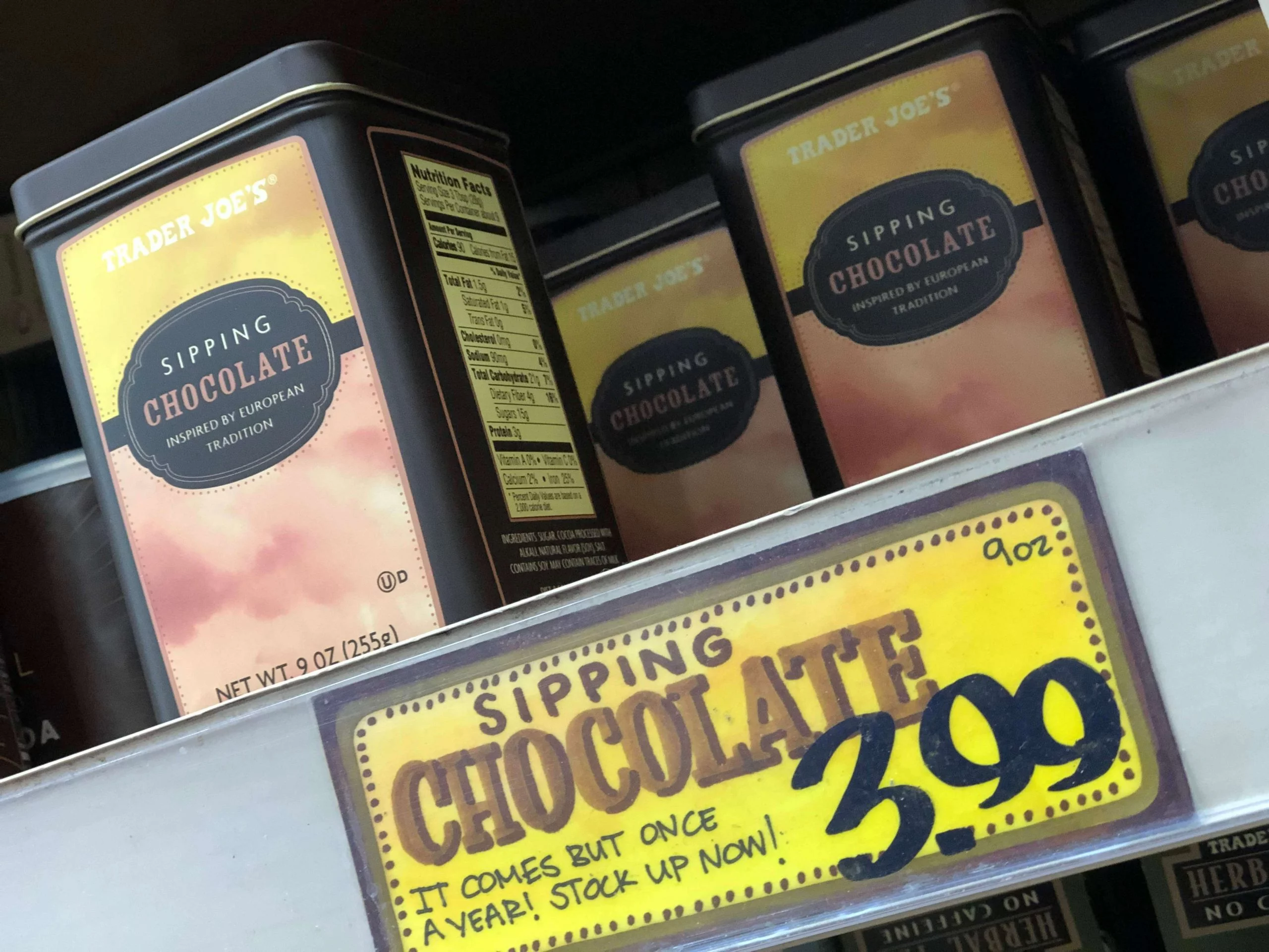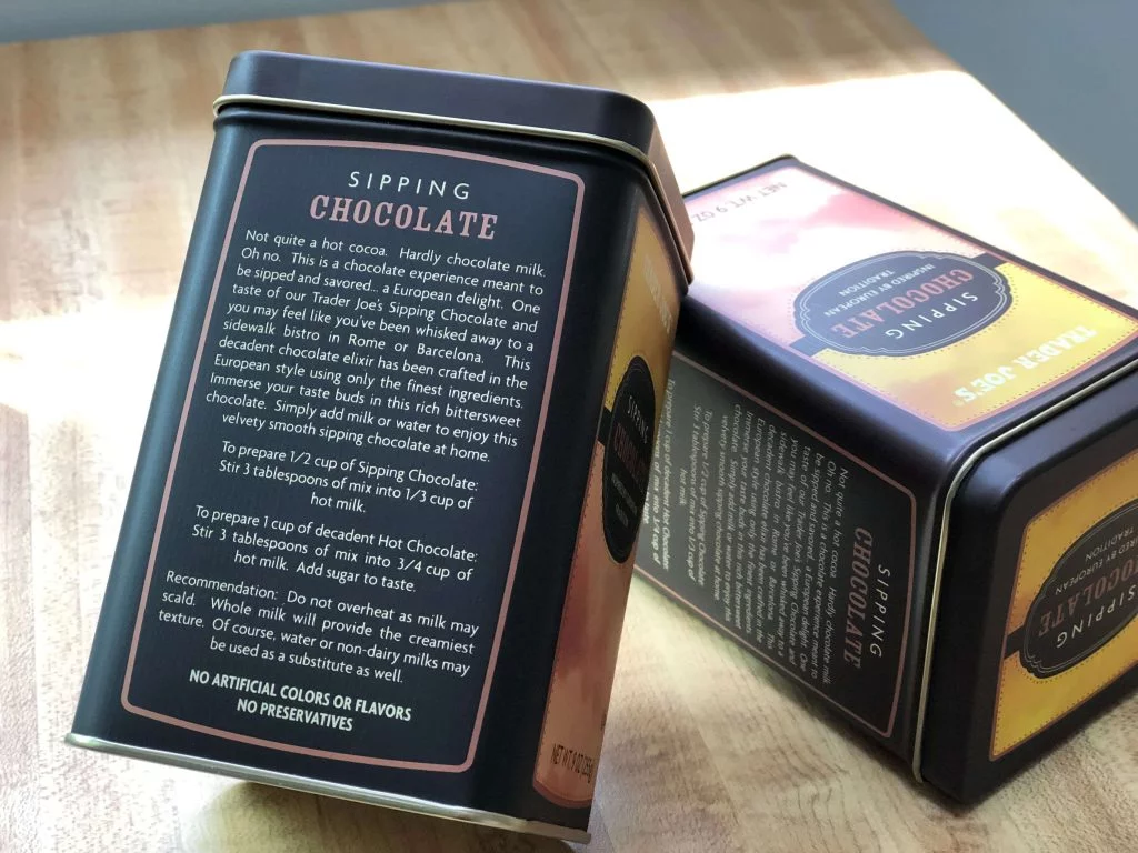 わたしたちトレーダージョーズがお届けするこのシッピングチョコを一口飲んでみてください。もうあなたは、ローマやバルセロナの歩道に店を構えるビストロまで、颯爽とワープしたような気分になるでしょう。このデカダントチョコエリクシールは、ヨーロッパ風の技法で、最高の原料だけを用いて丹念に作り上げられた逸品。